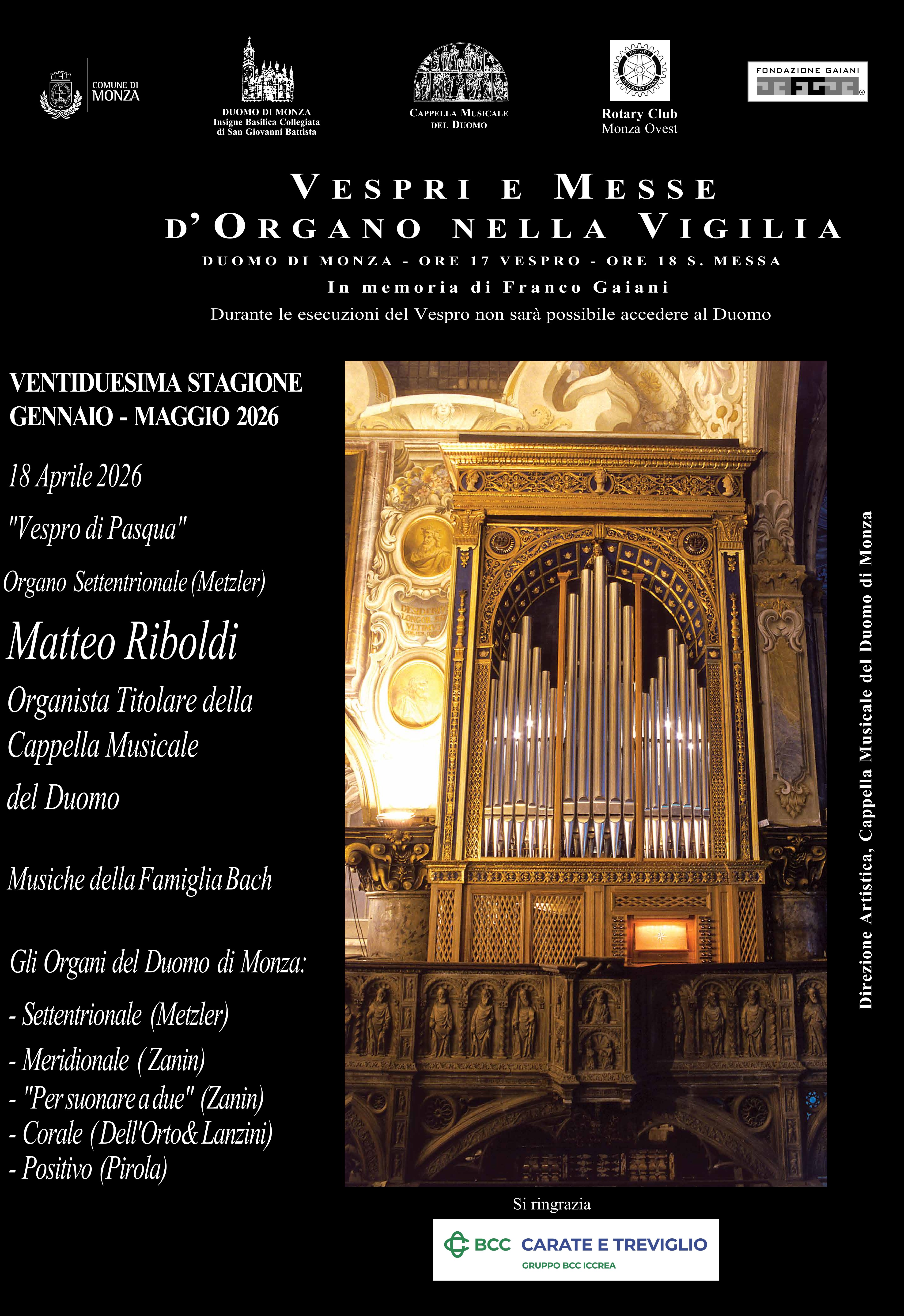 Vespri e Messe d'organo nella Vigilia - Ventiduesima Stagione - 18 aprile 2026